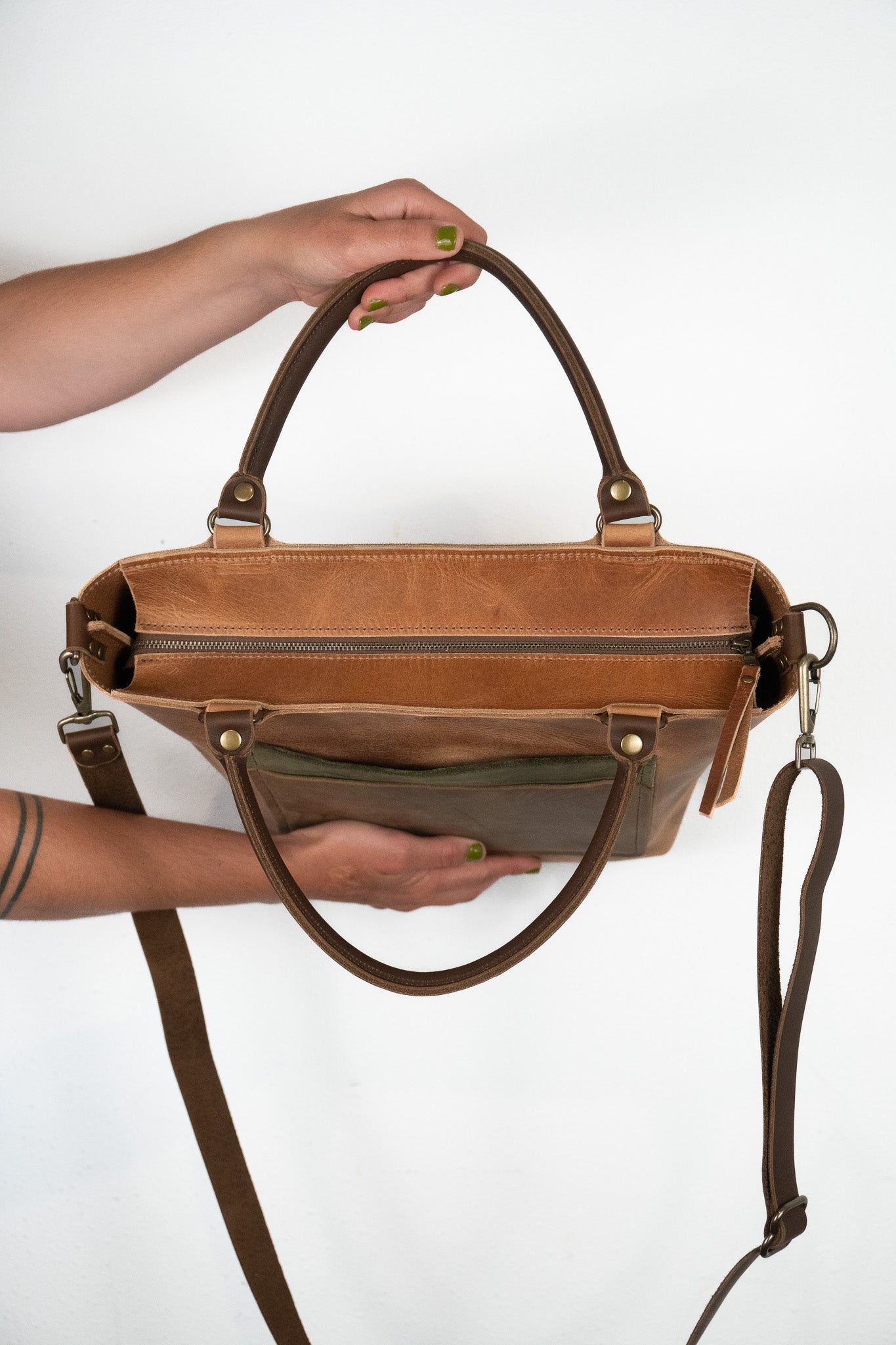 • Rolled leather tote handles for comfortable hold
